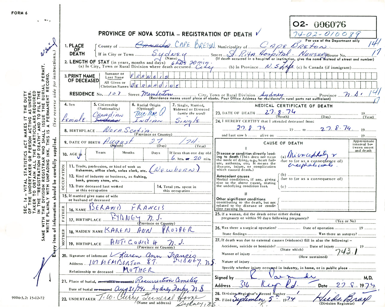 Female Death Registration: Year: 1974 number: 6076