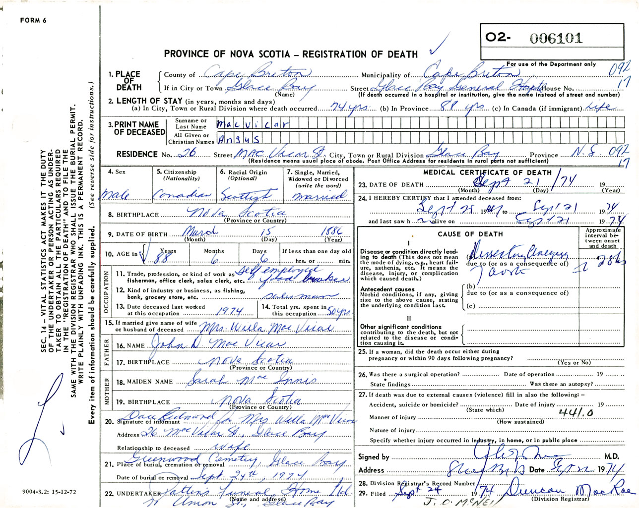 Male Death Registration: Year: 1974 number: 6101