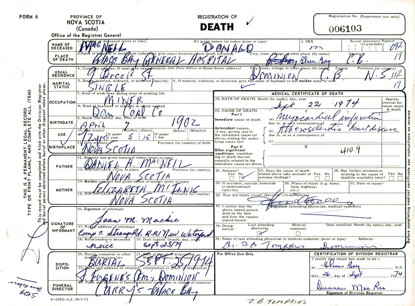 Male Death Registration: Year: 1974 number: 6103