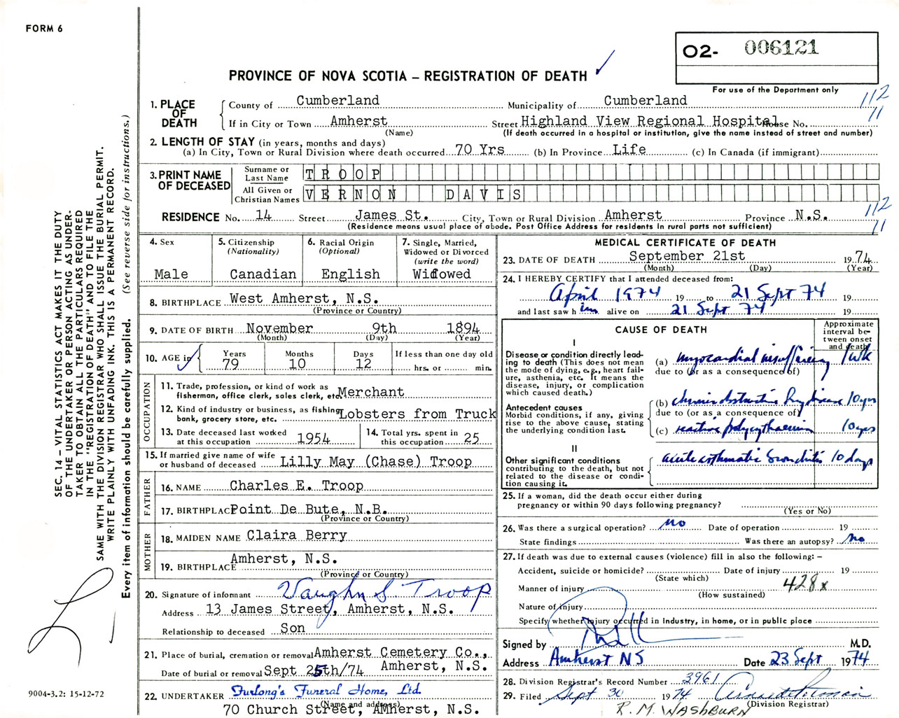 Male Death Registration: Year: 1974 number: 6121