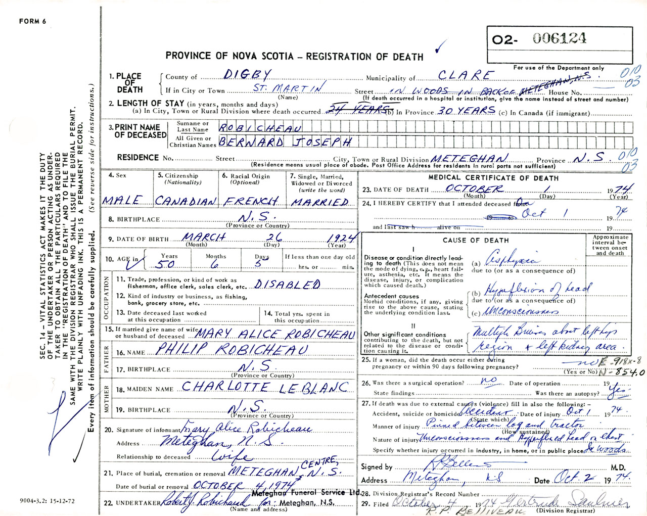 Male Death Registration: Year: 1974 number: 6124