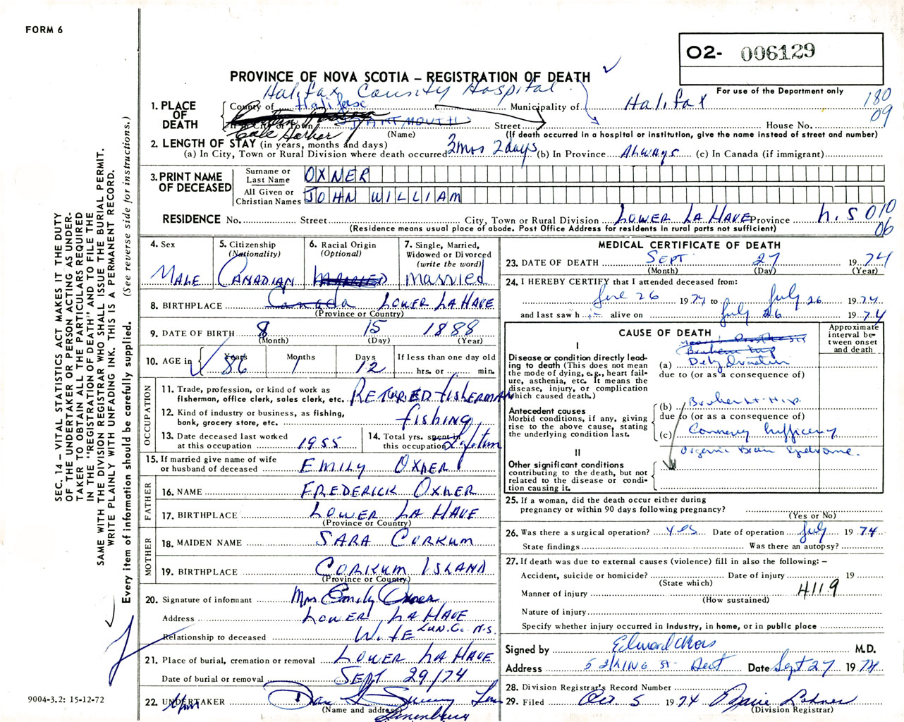 Male Death Registration: Year: 1974 number: 6129