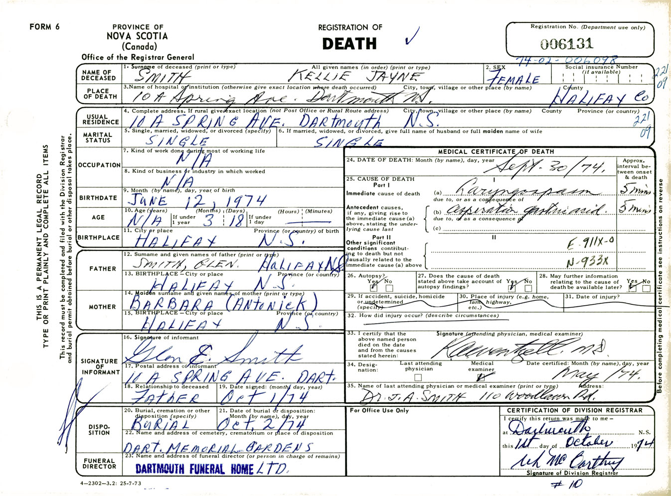 Female Death Registration: Year: 1974 number: 6131