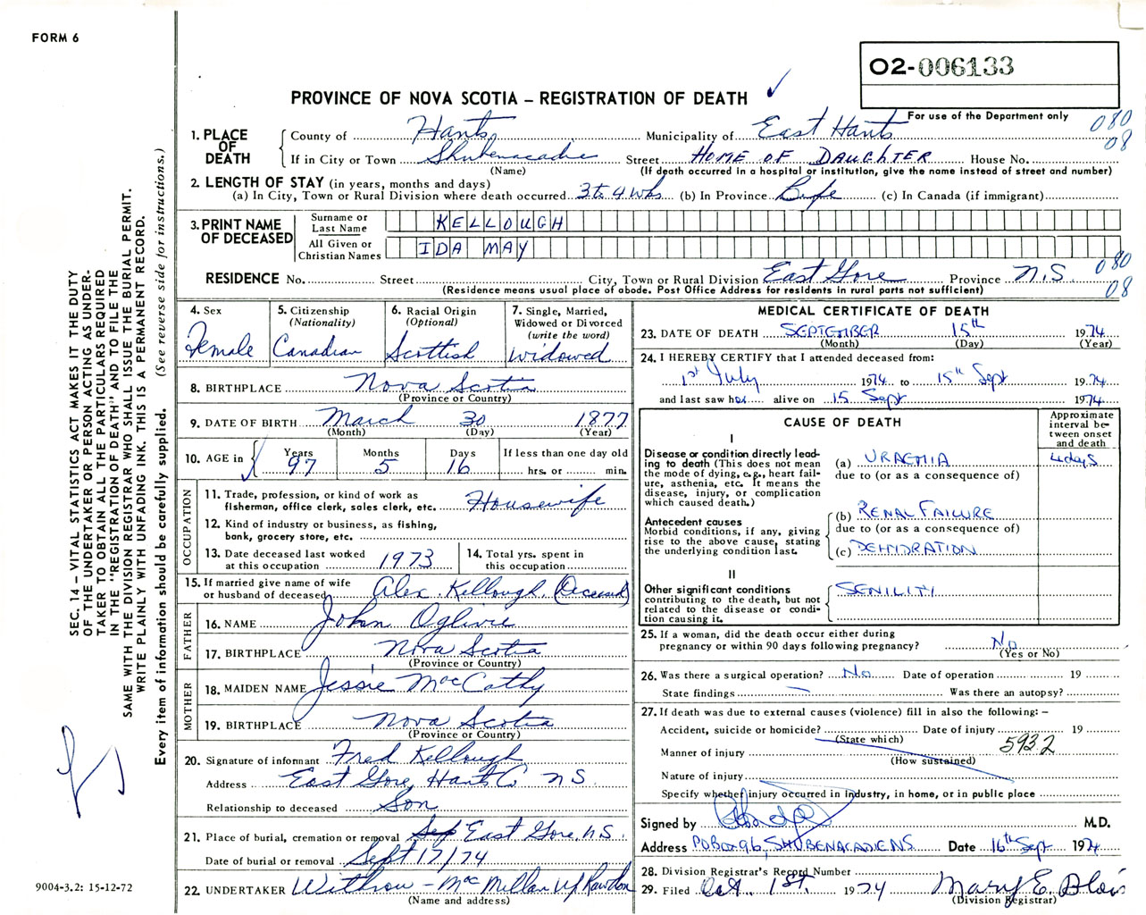 Female Death Registration: Year: 1974 number: 6133
