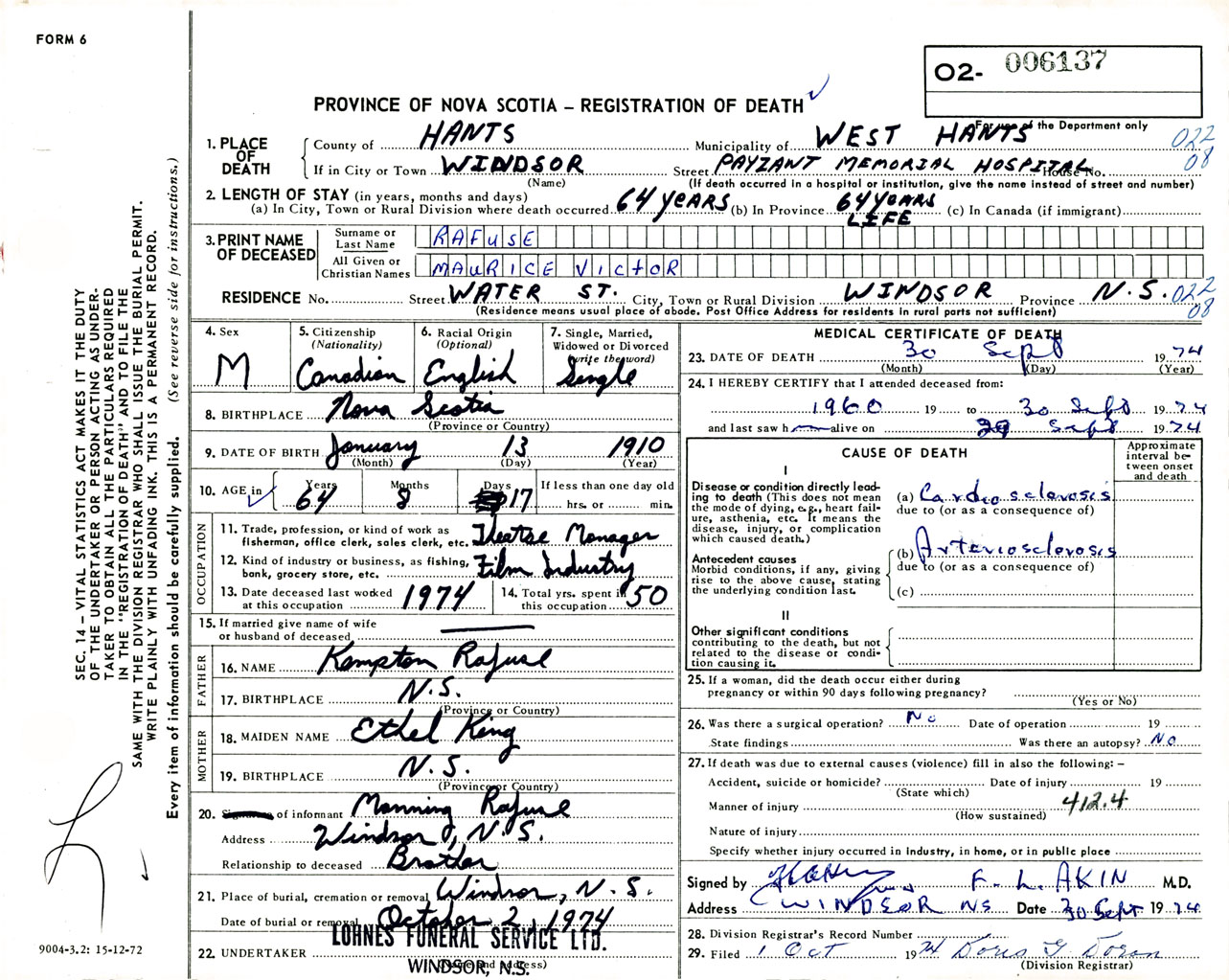 Male Death Registration: Year: 1974 number: 6137