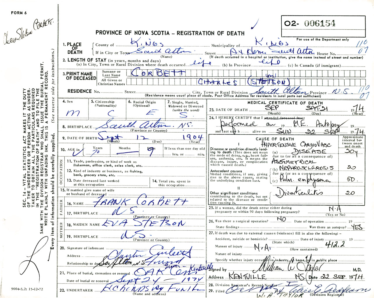 Male Death Registration: Year: 1974 number: 6154
