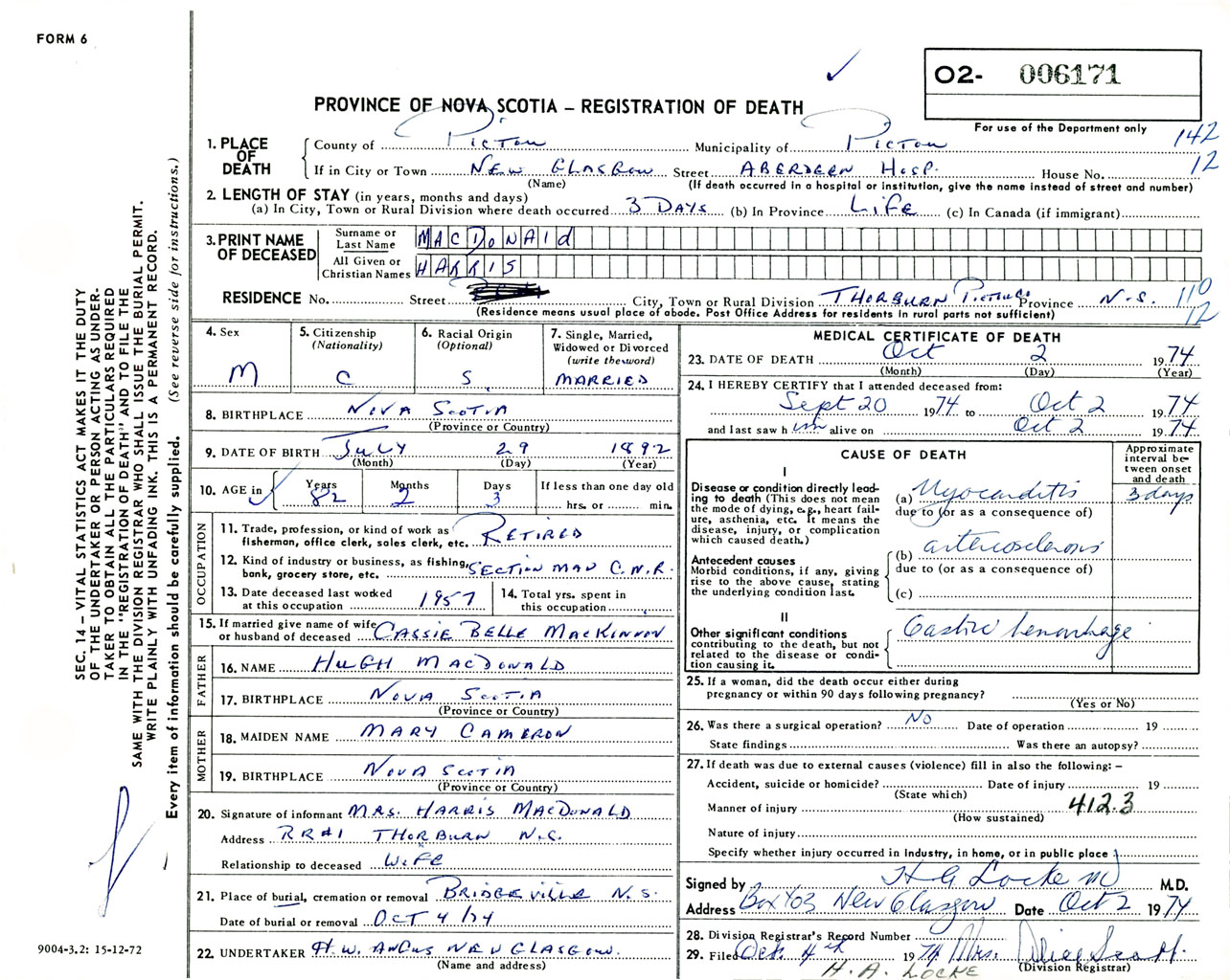 Male Death Registration: Year: 1974 number: 6171