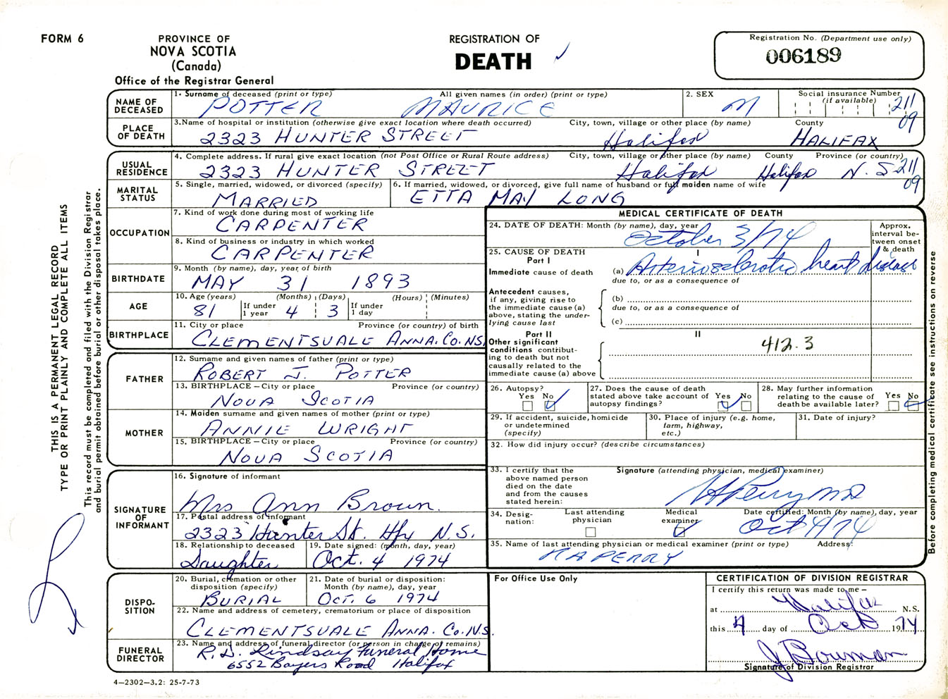 Male Death Registration: Year: 1974 number: 6189