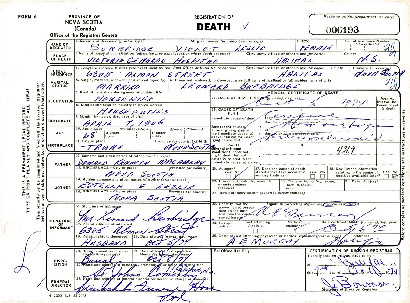 Female Death Registration: Year: 1974 number: 6193