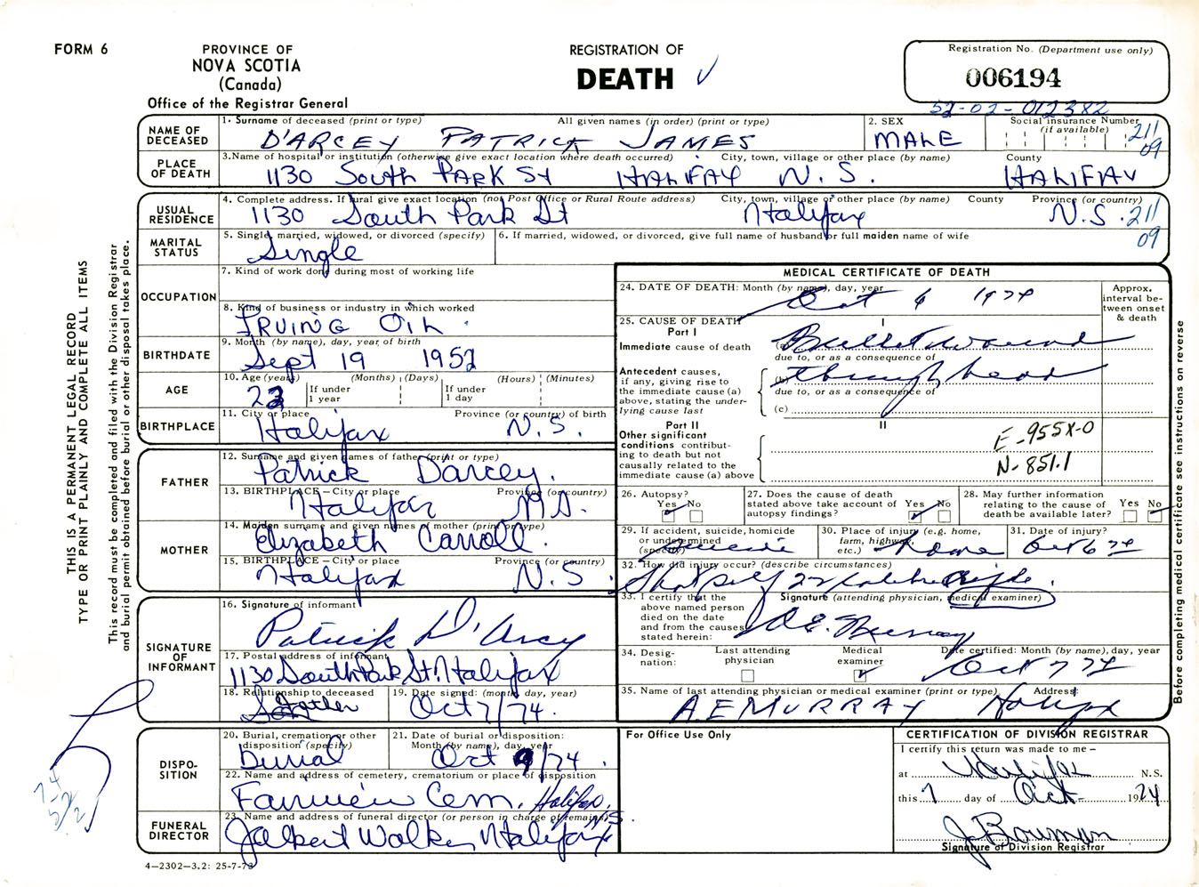 Male Death Registration: Year: 1974 number: 6194
