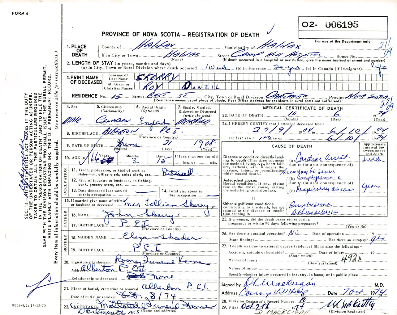 Male Death Registration: Year: 1974 number: 6195
