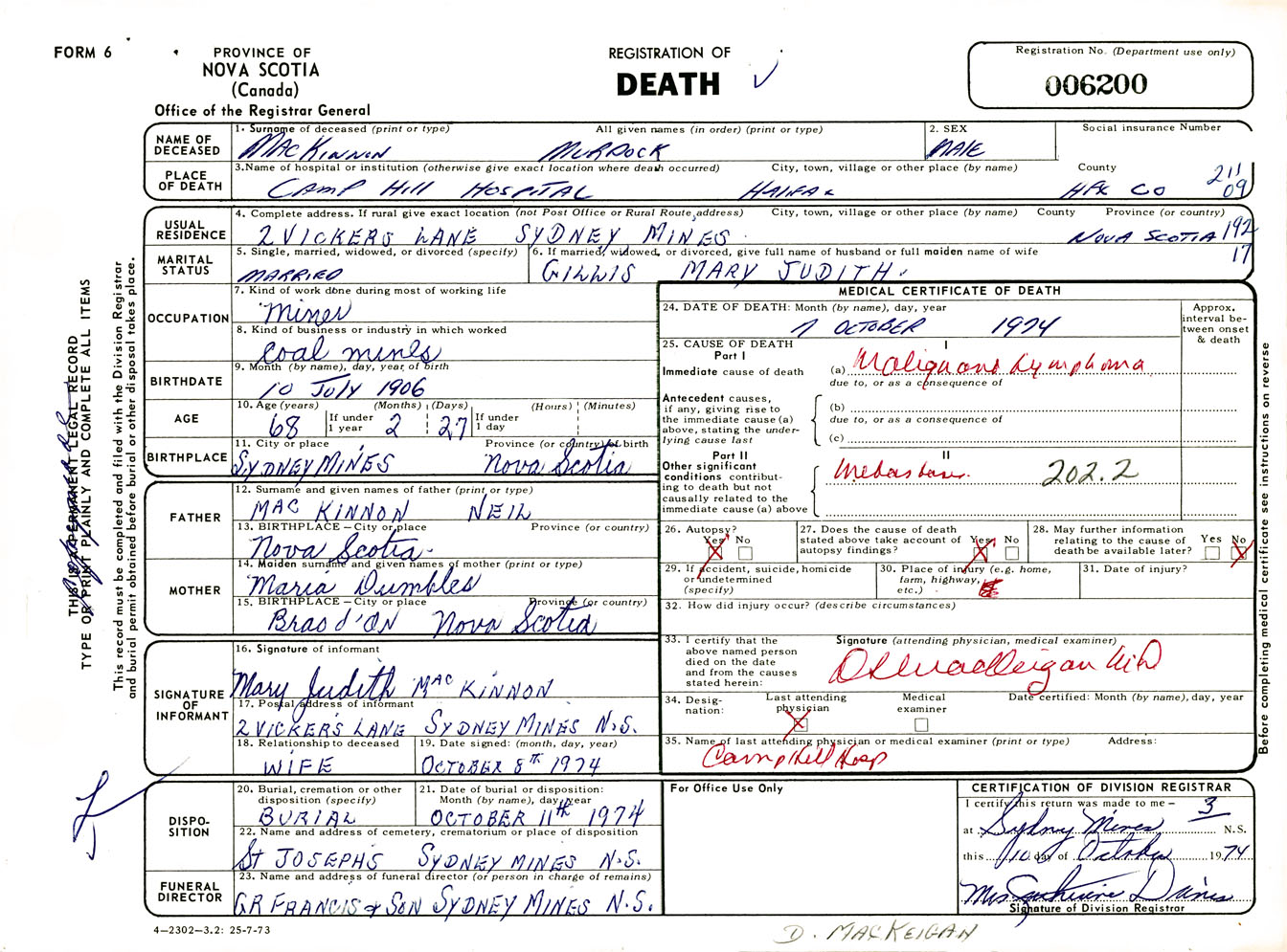 Male Death Registration: Year: 1974 number: 6200