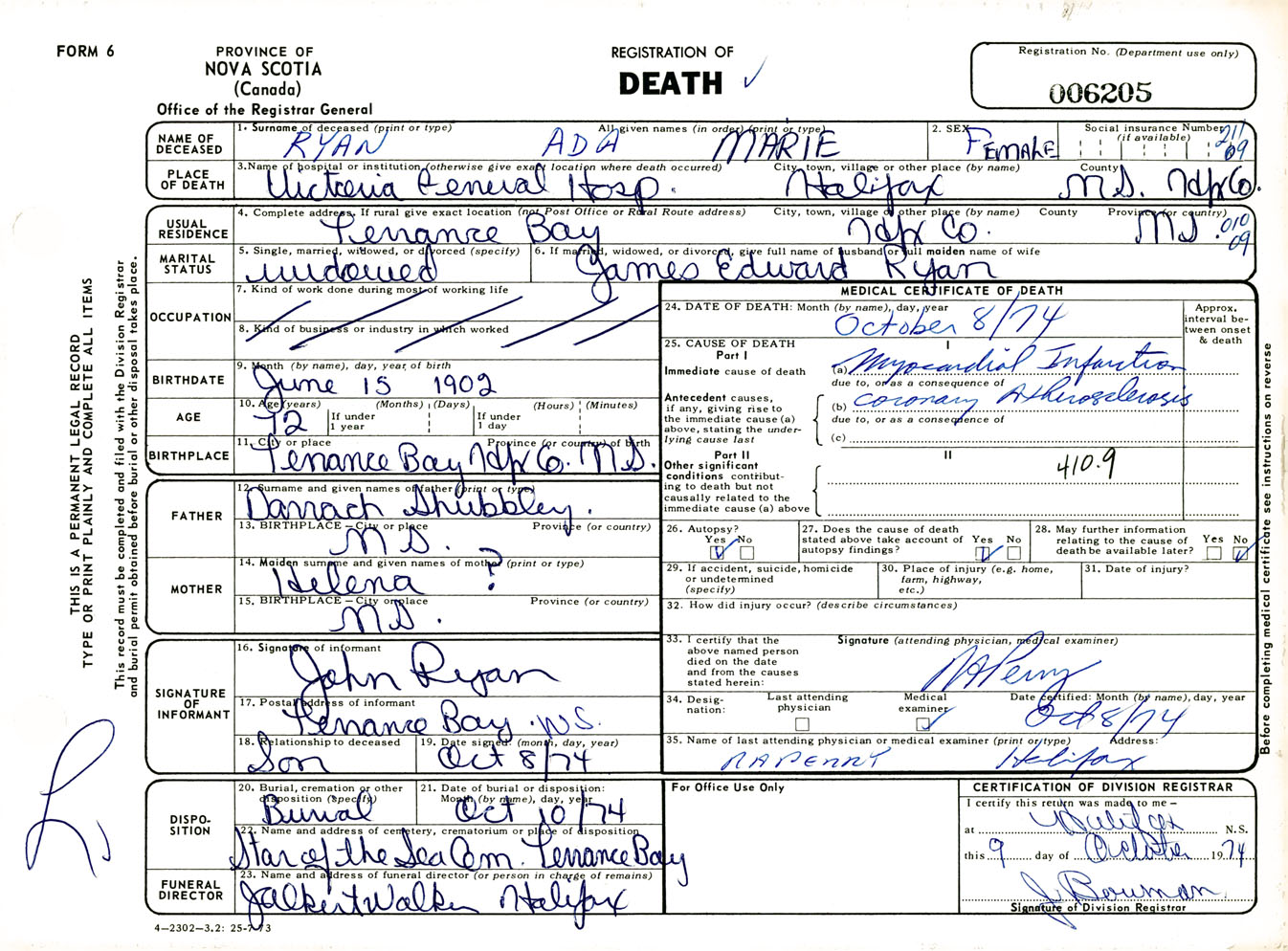 Female Death Registration: Year: 1974 number: 6205