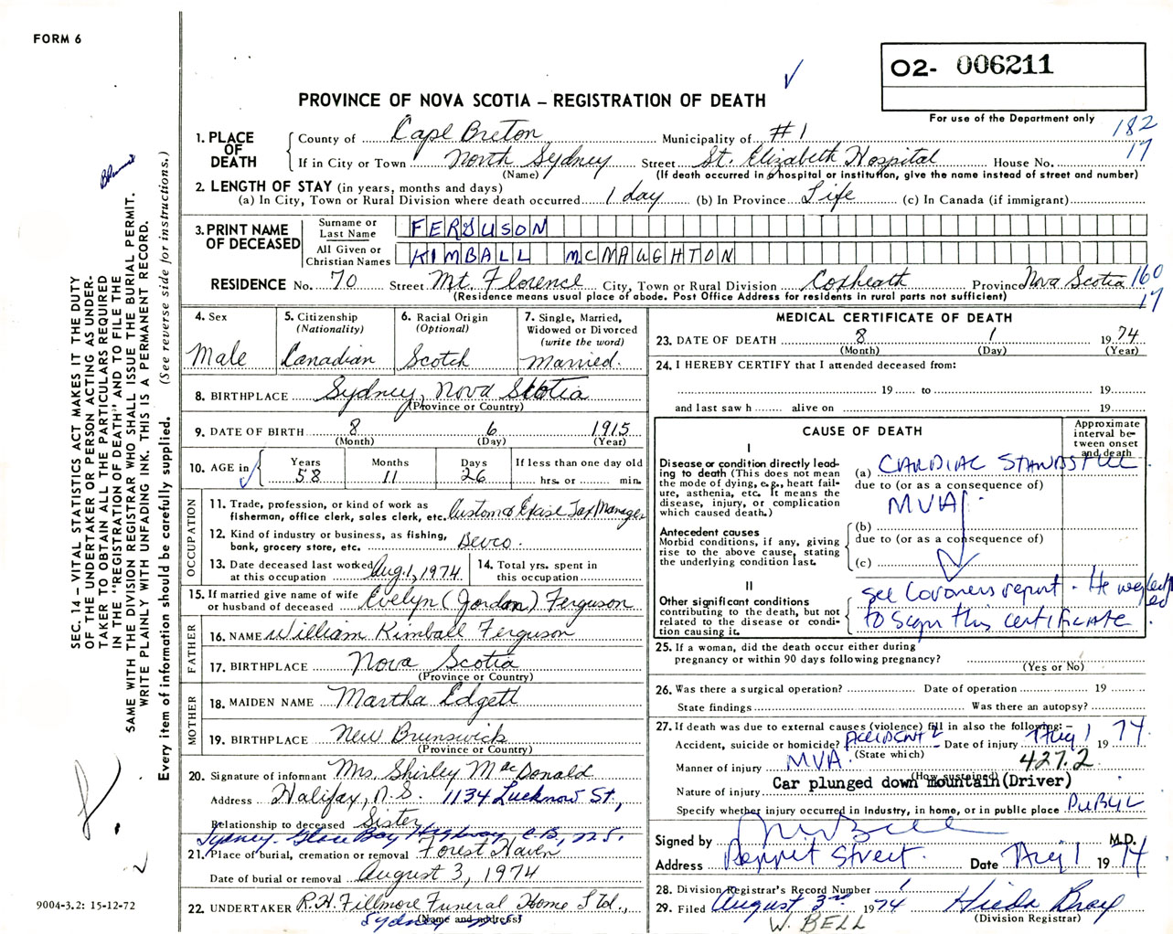 Male Death Registration: Year: 1974 number: 6211
