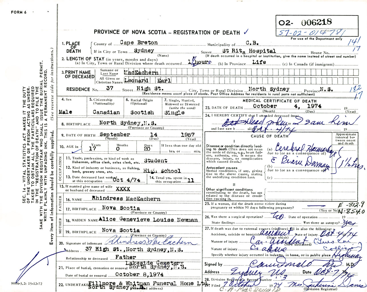 Male Death Registration: Year: 1974 number: 6218