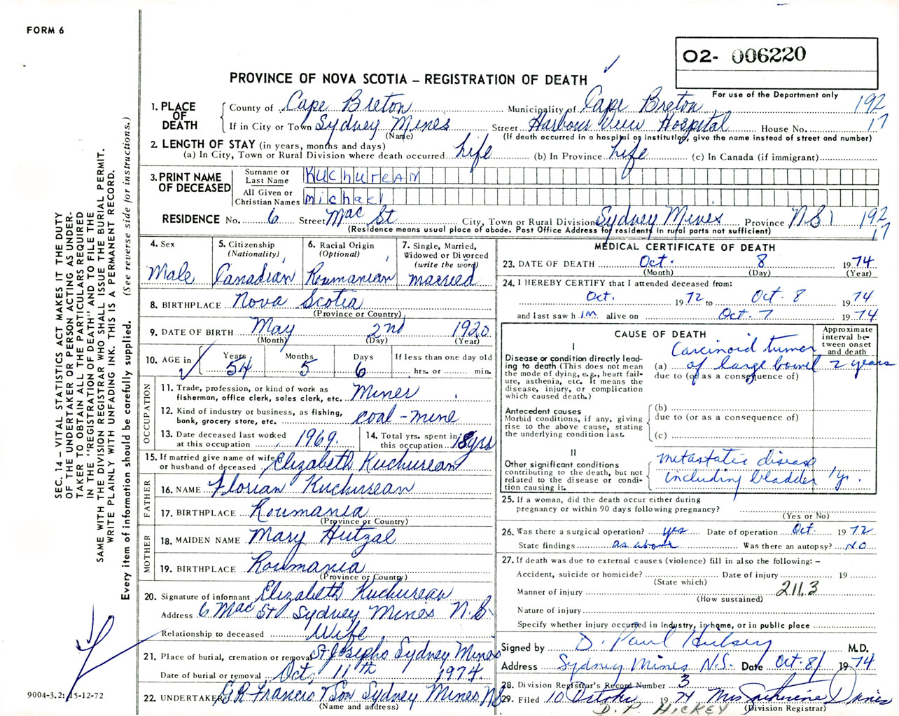 Male Death Registration: Year: 1974 number: 6220