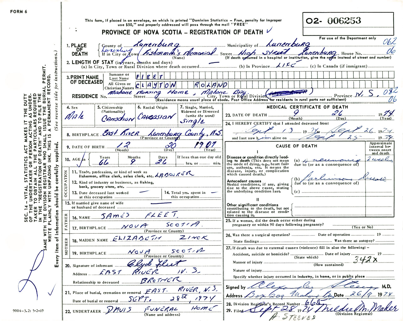 Male Death Registration: Year: 1974 number: 6253