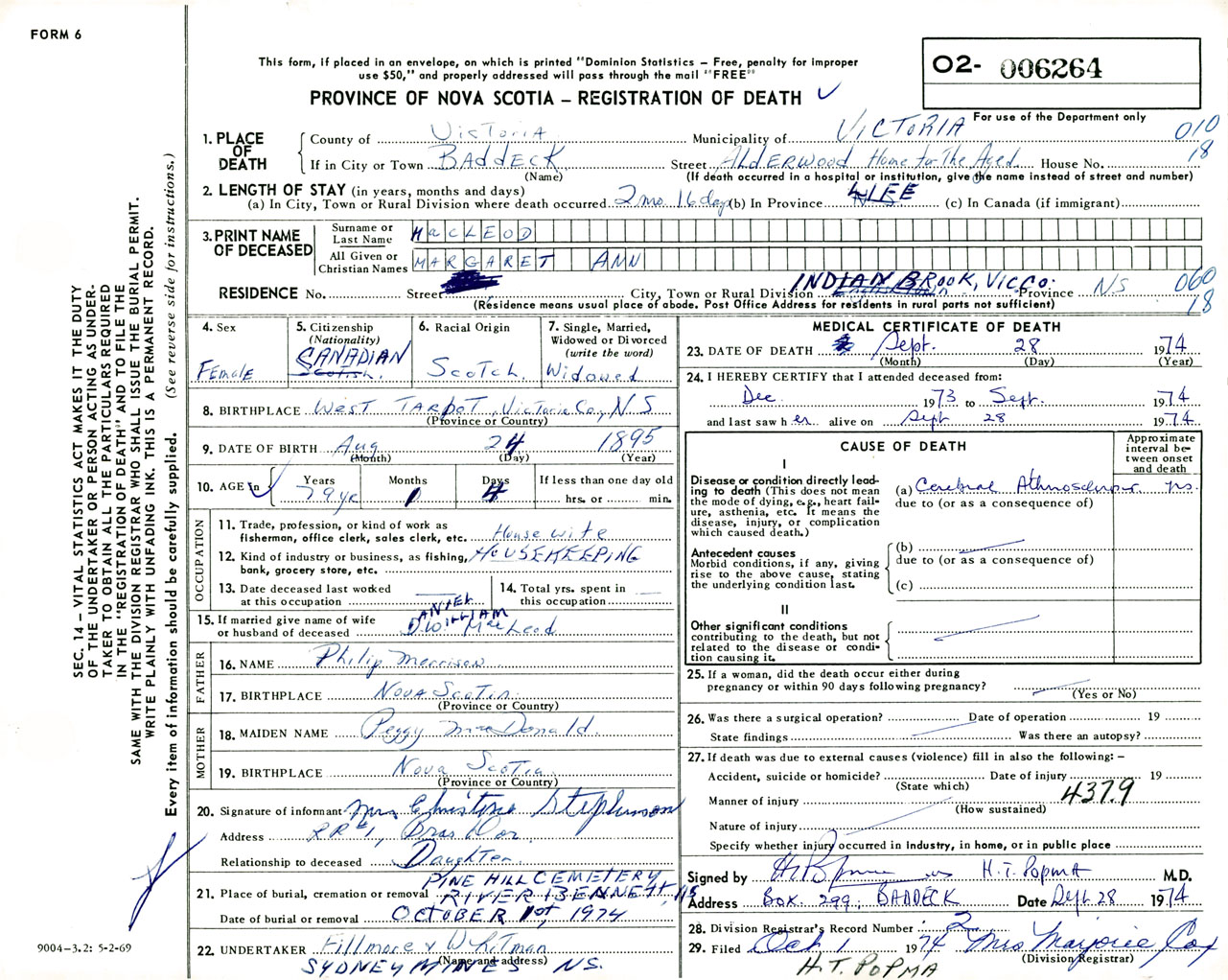 Female Death Registration: Year: 1974 number: 6264