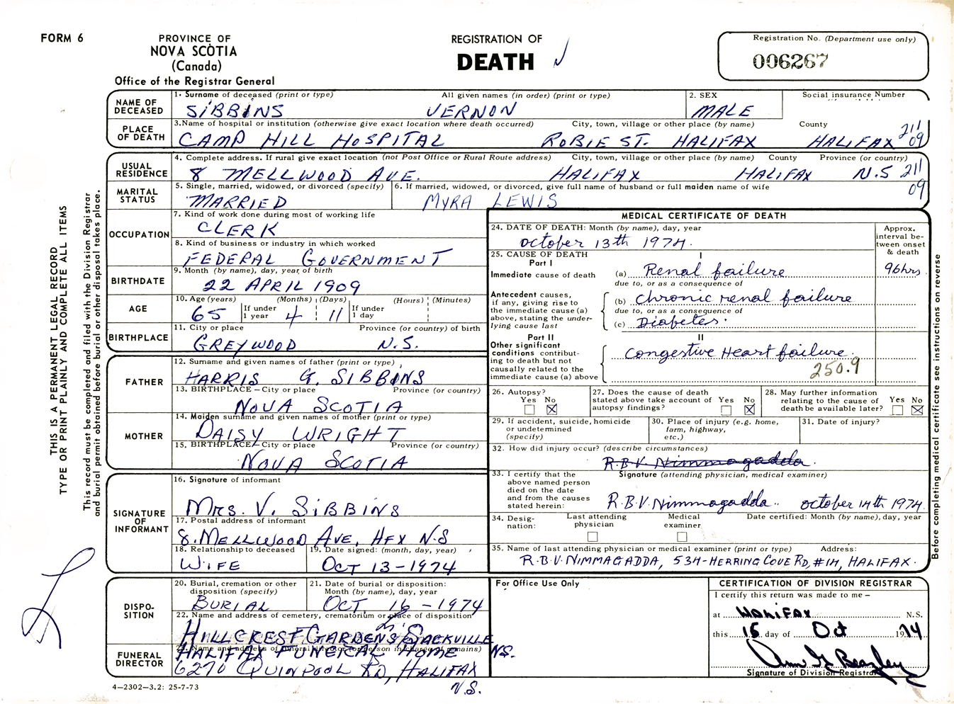 Male Death Registration: Year: 1974 number: 6267