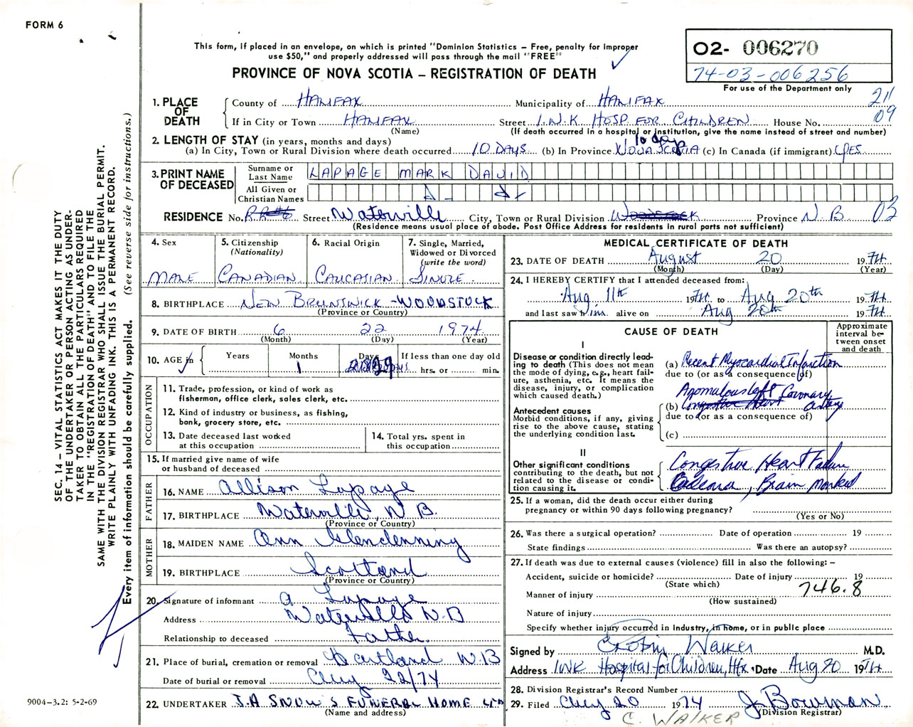 Male Death Registration: Year: 1974 number: 6270