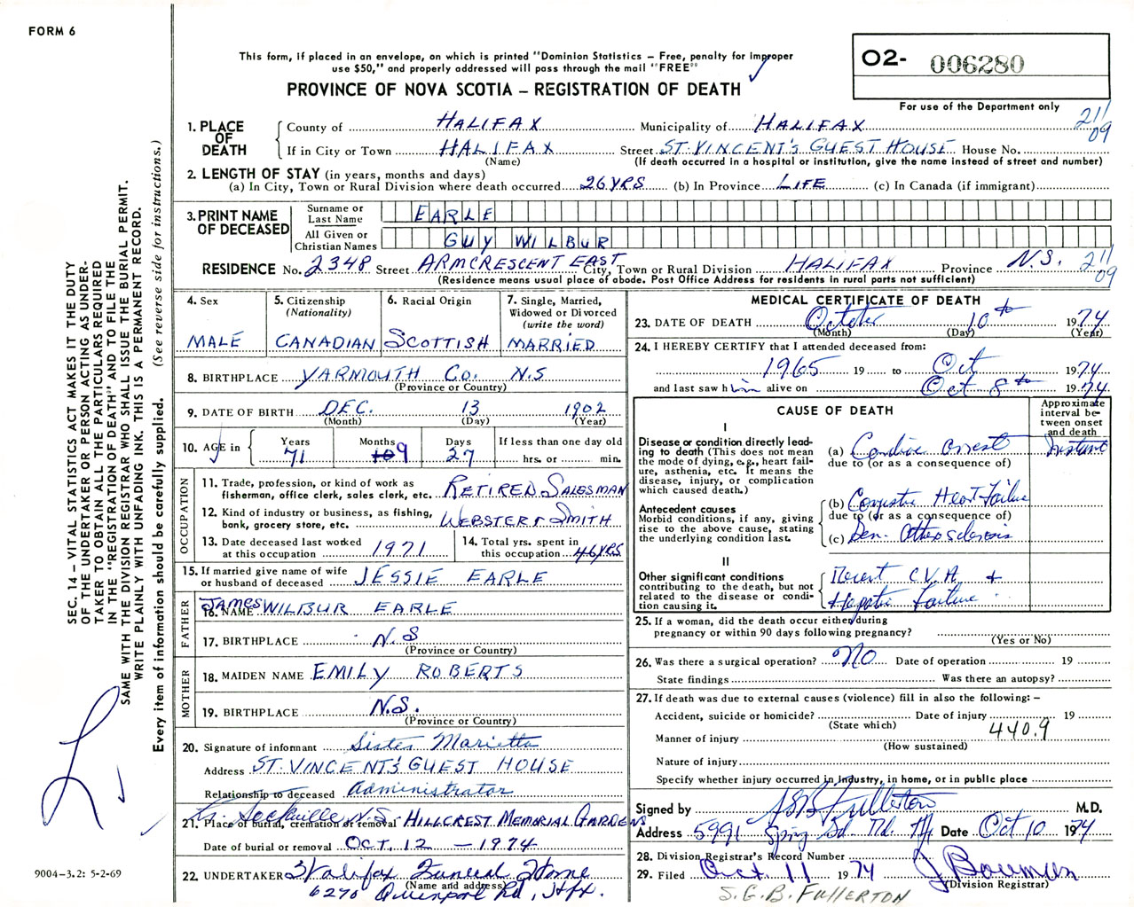 Male Death Registration: Year: 1974 number: 6280