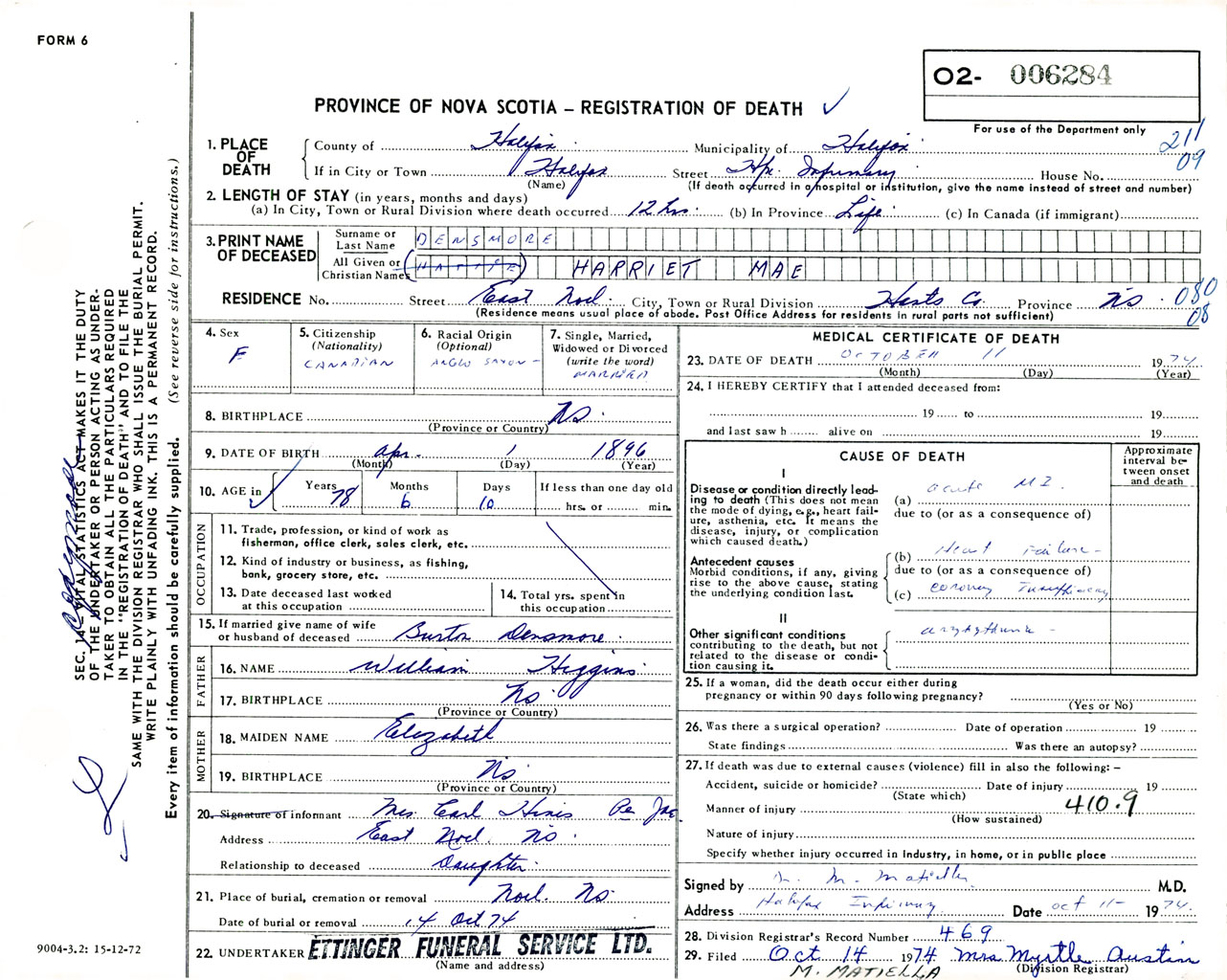Female Death Registration: Year: 1974 number: 6284