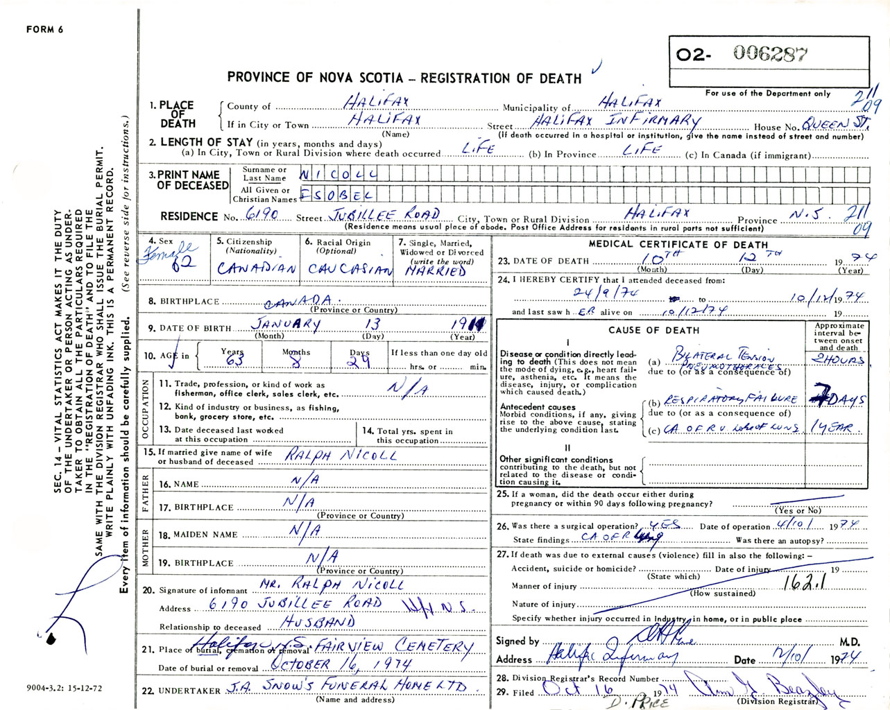 Female Death Registration: Year: 1974 number: 6287