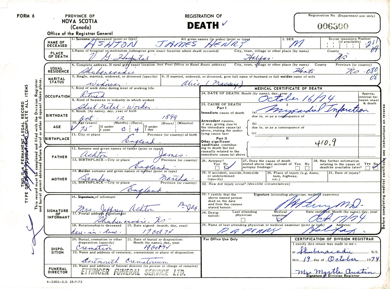 Male Death Registration: Year: 1974 number: 6300