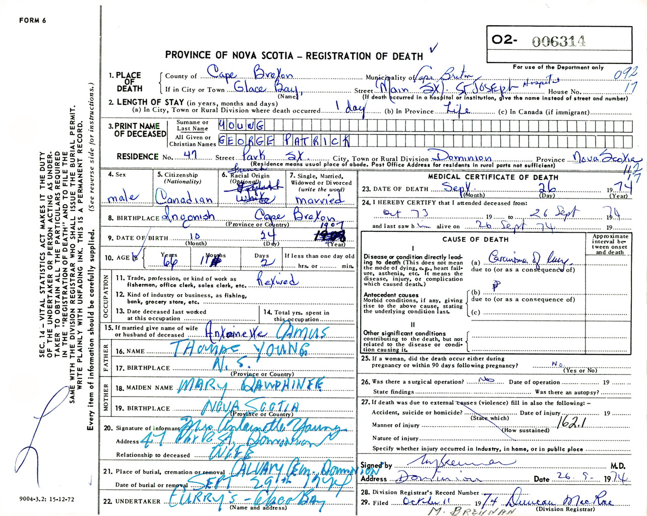Male Death Registration: Year: 1974 number: 6314