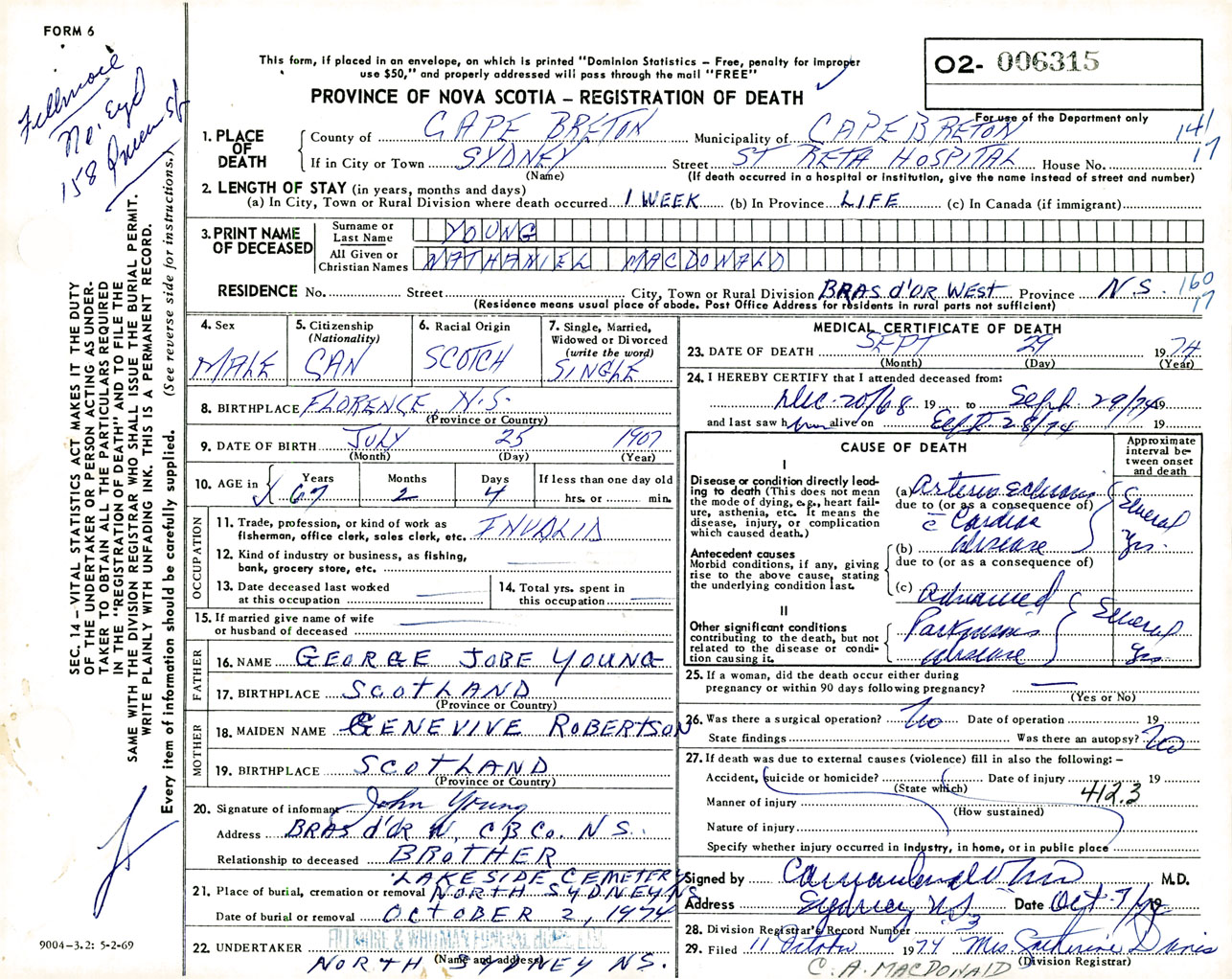 Male Death Registration: Year: 1974 number: 6315