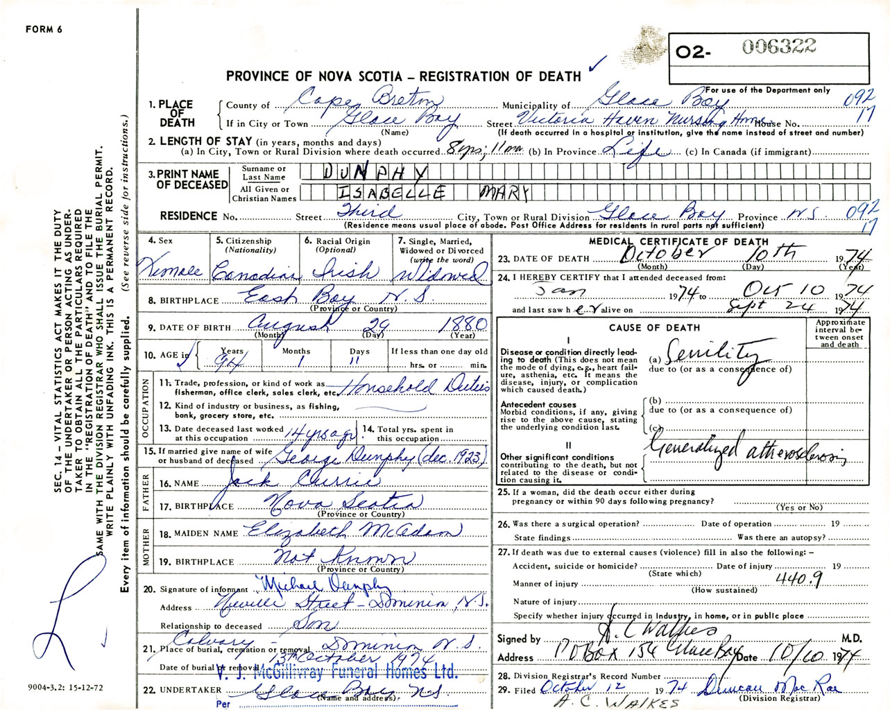 Female Death Registration: Year: 1974 number: 6322