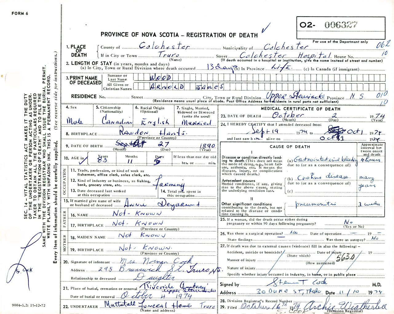 Male Death Registration: Year: 1974 number: 6327