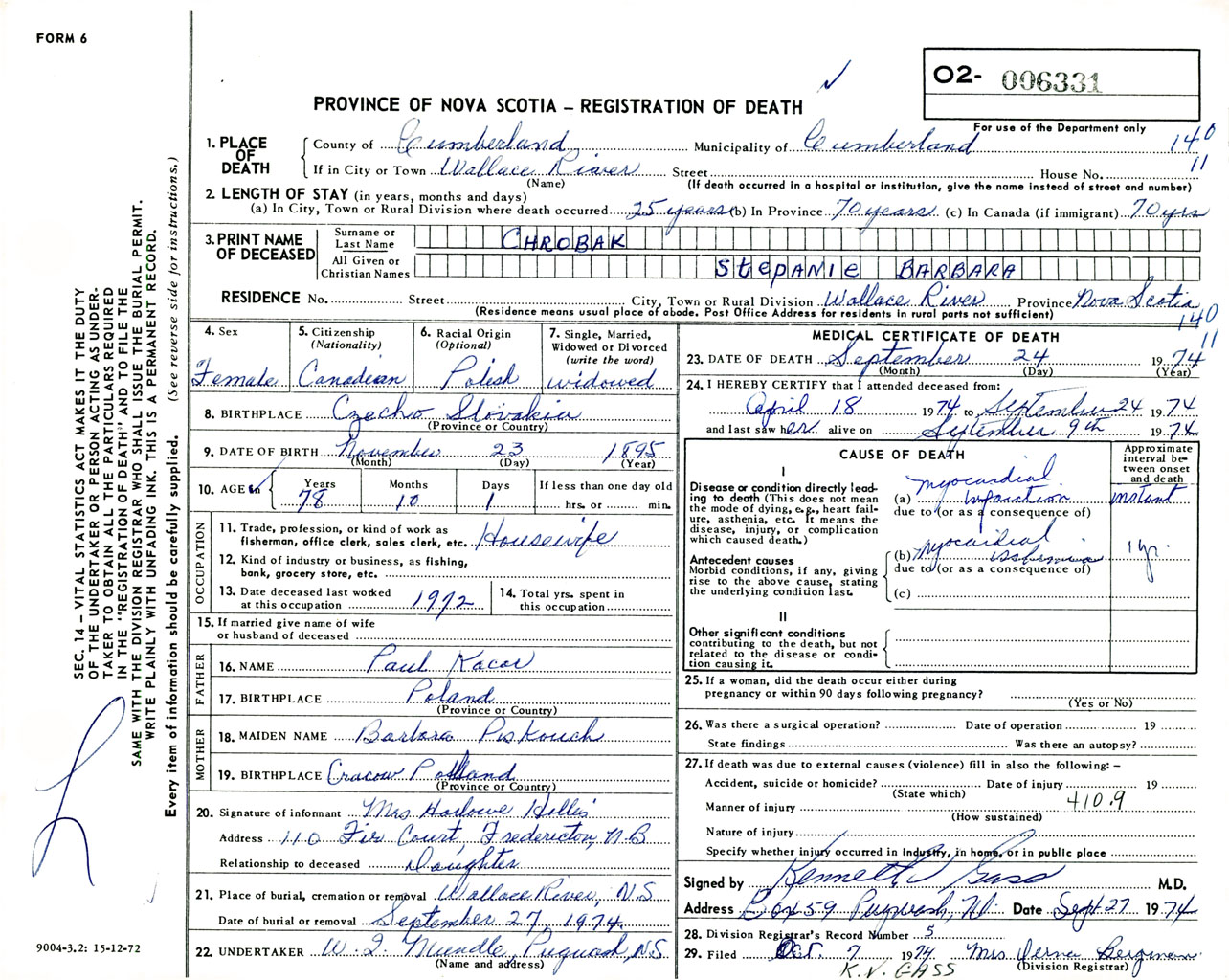 Female Death Registration: Year: 1974 number: 6331
