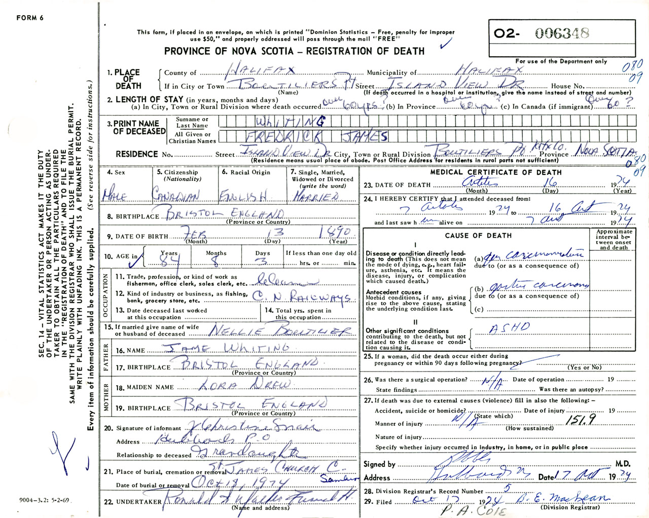 Male Death Registration: Year: 1974 number: 6348