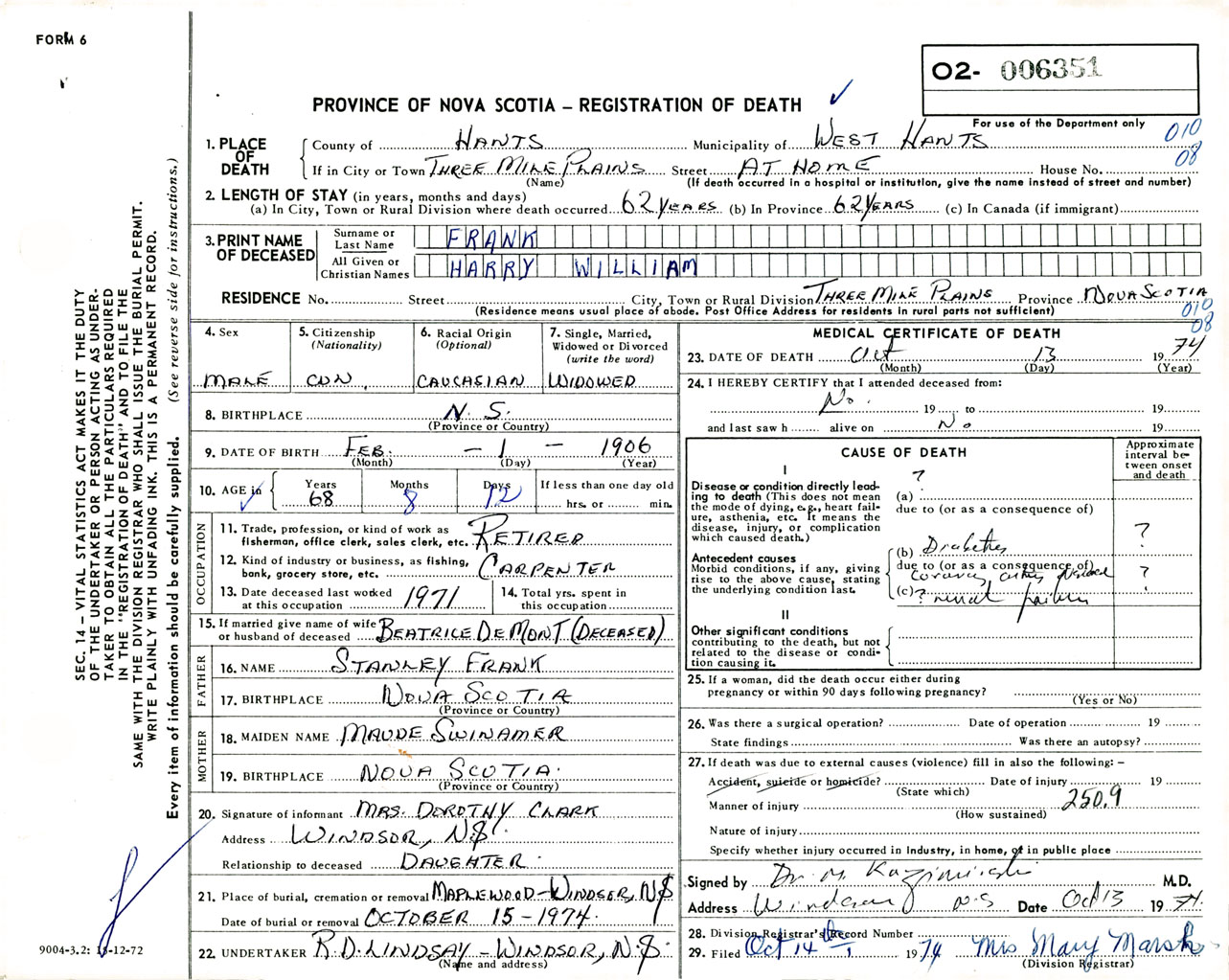 Male Death Registration: Year: 1974 number: 6351