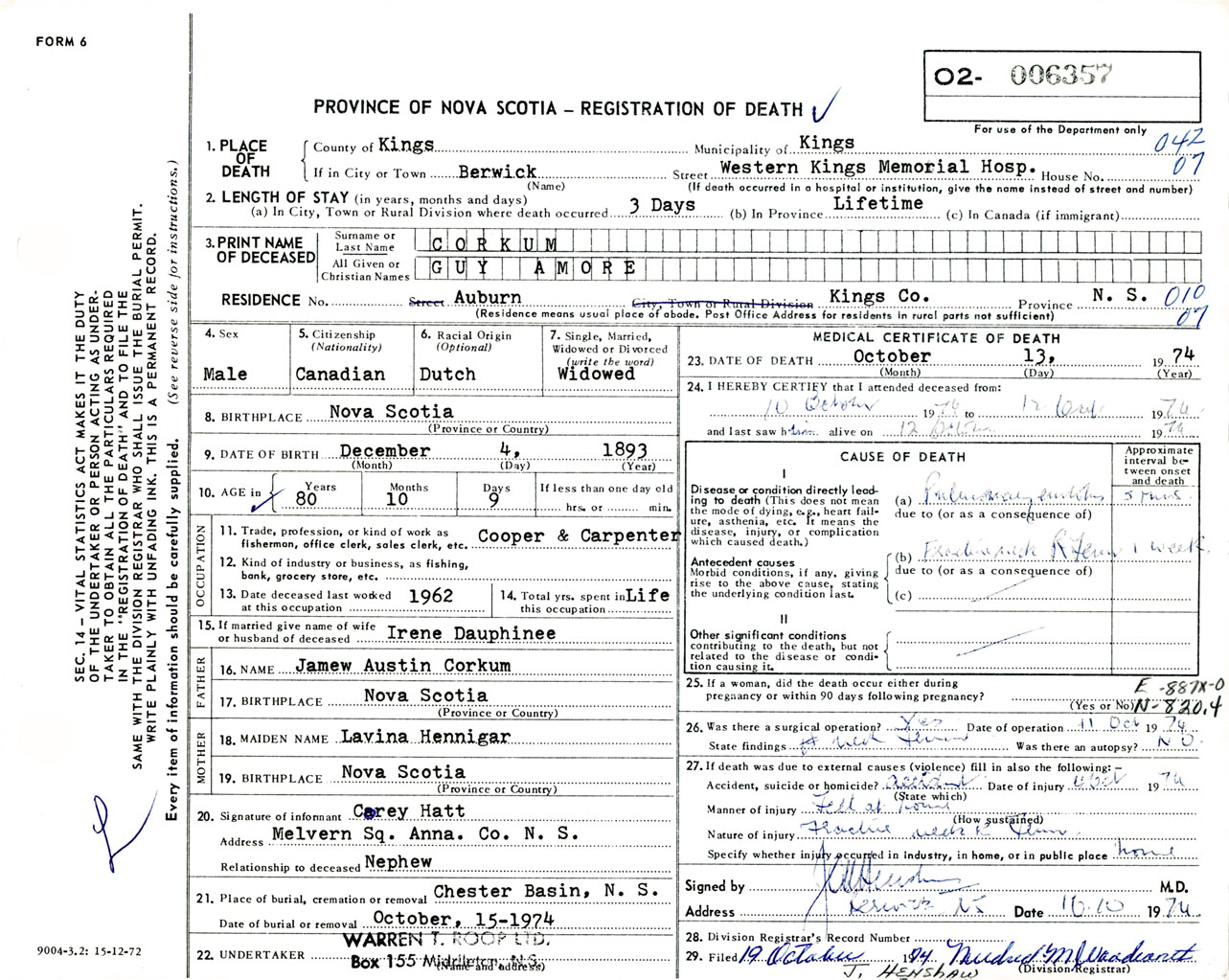 Male Death Registration: Year: 1974 number: 6357