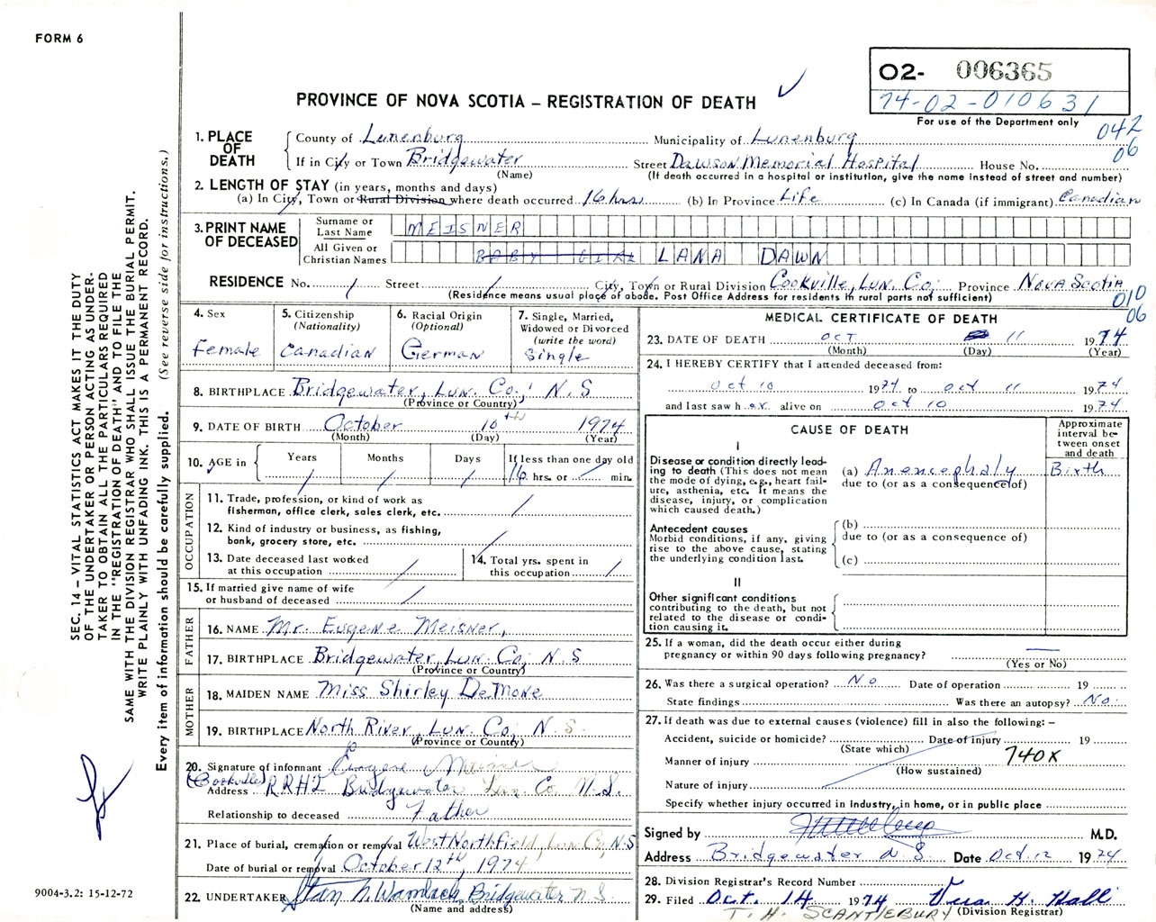 Female Death Registration: Year: 1974 number: 6365