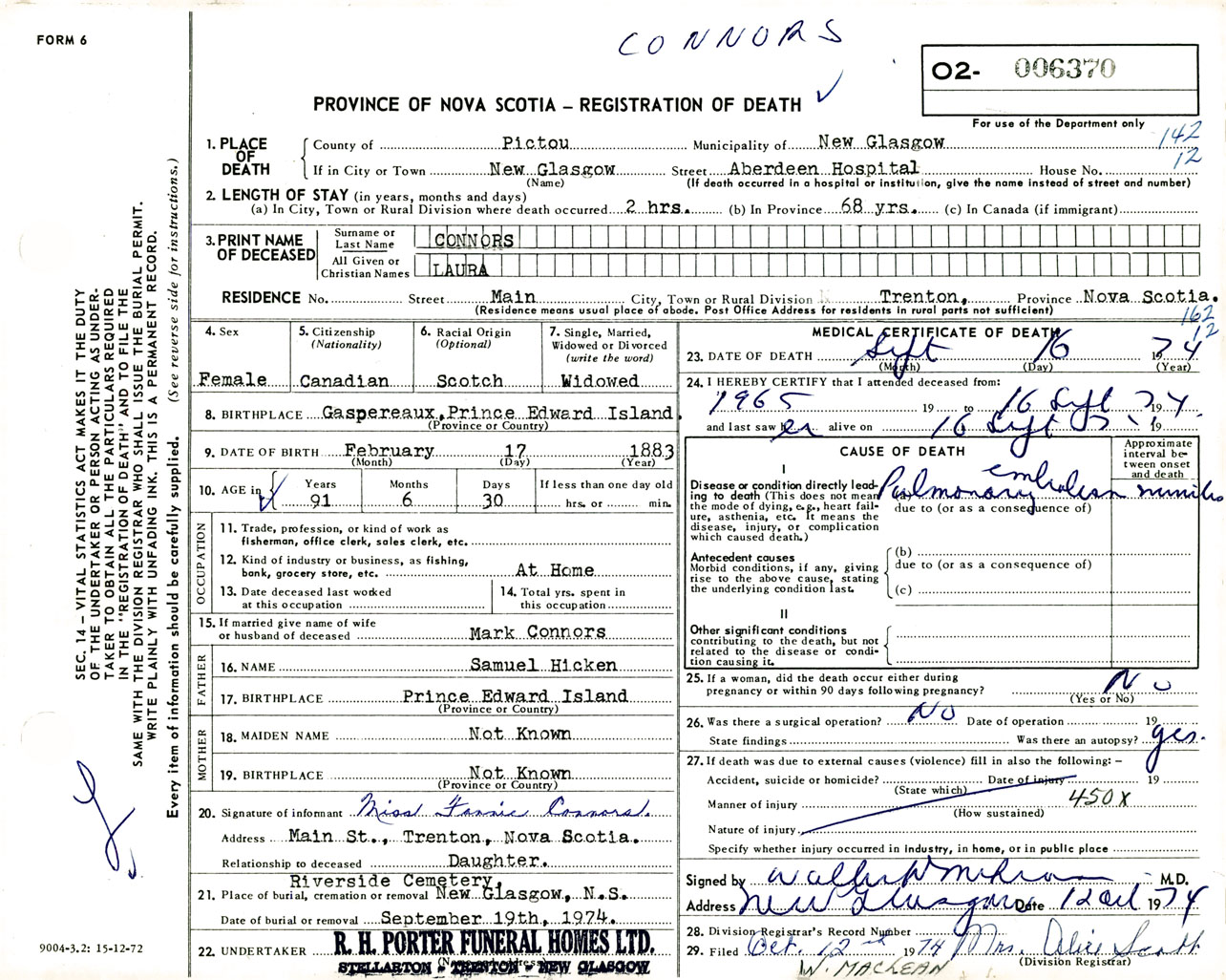 Female Death Registration: Year: 1974 number: 6370