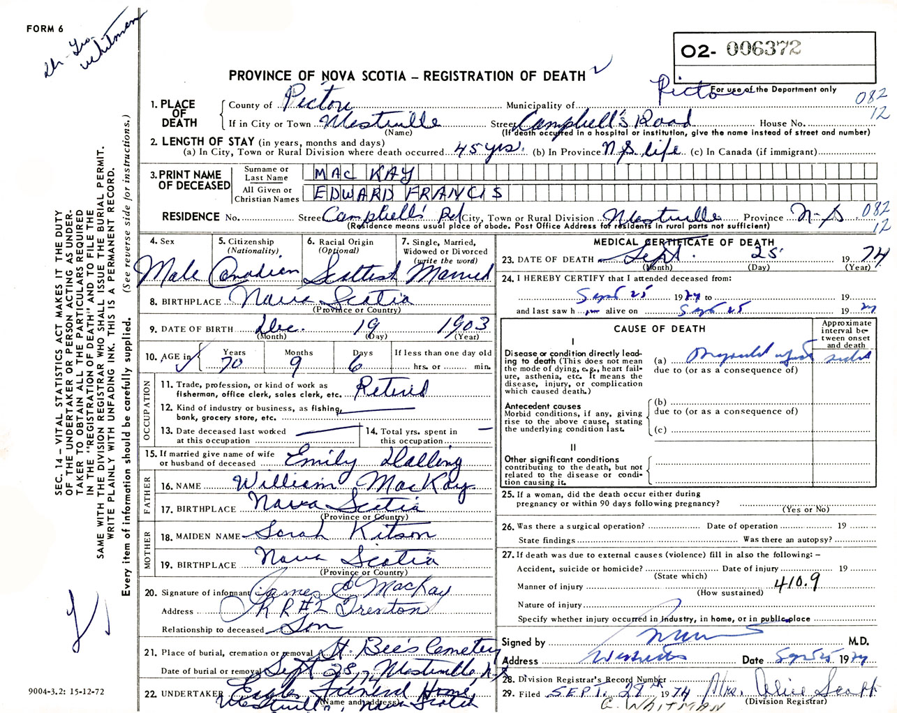 Male Death Registration: Year: 1974 number: 6372