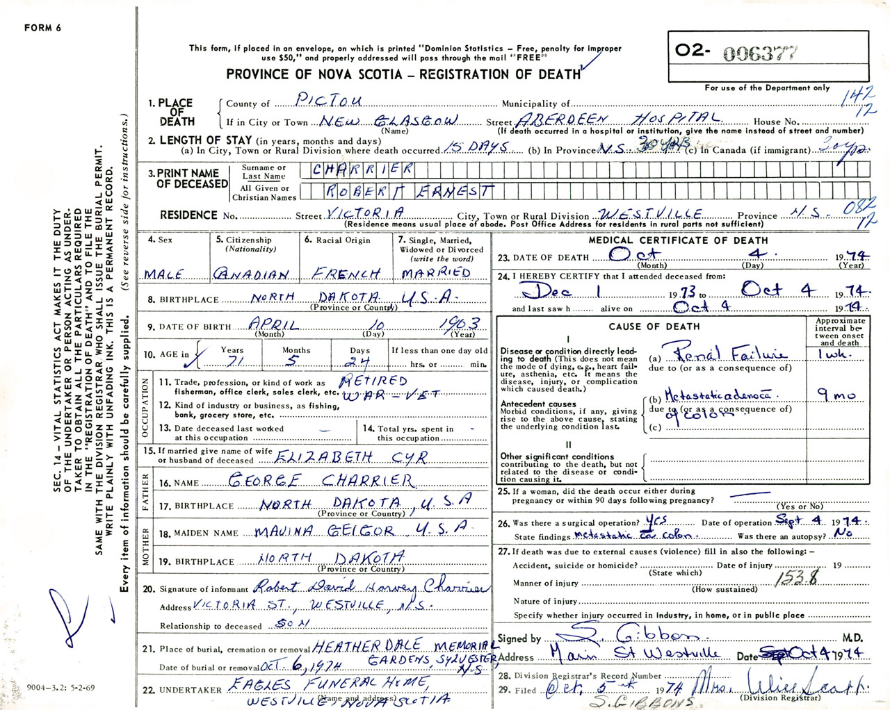 Male Death Registration: Year: 1974 number: 6377