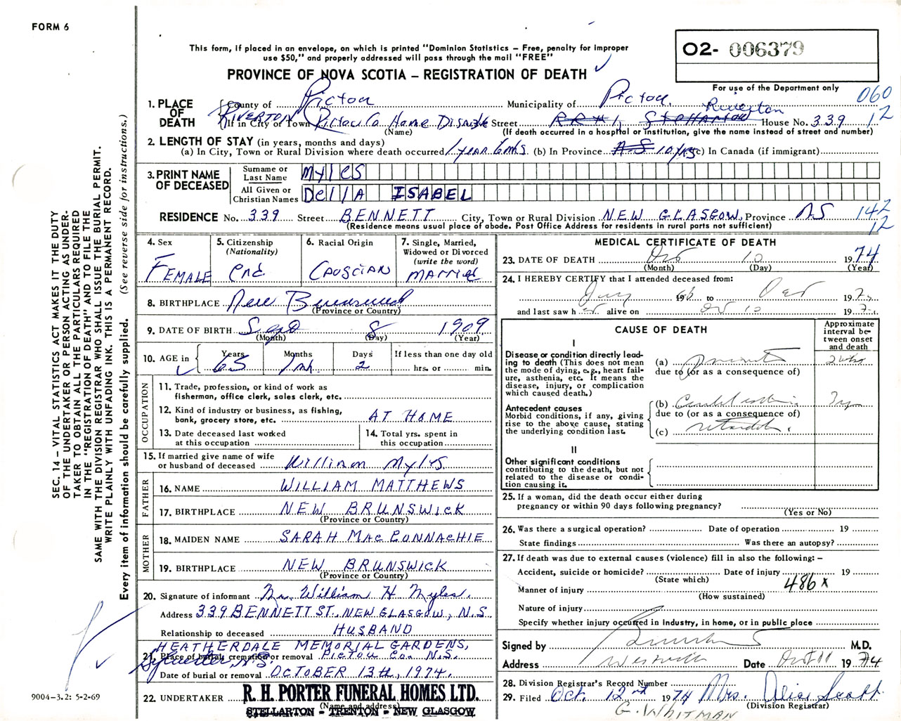 Female Death Registration: Year: 1974 number: 6379