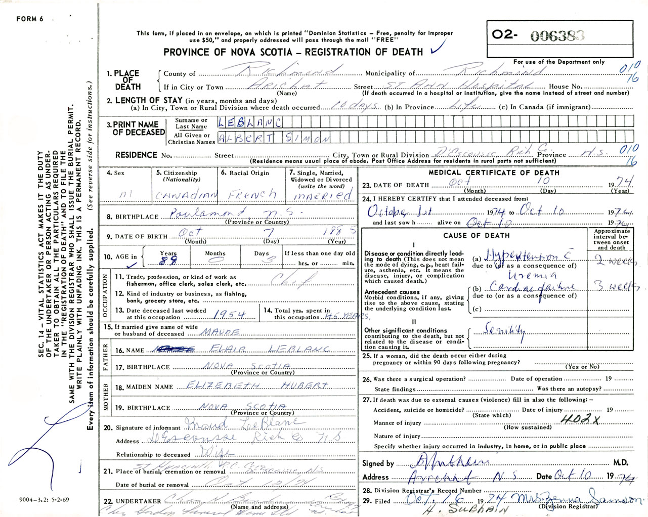 Male Death Registration: Year: 1974 number: 6383