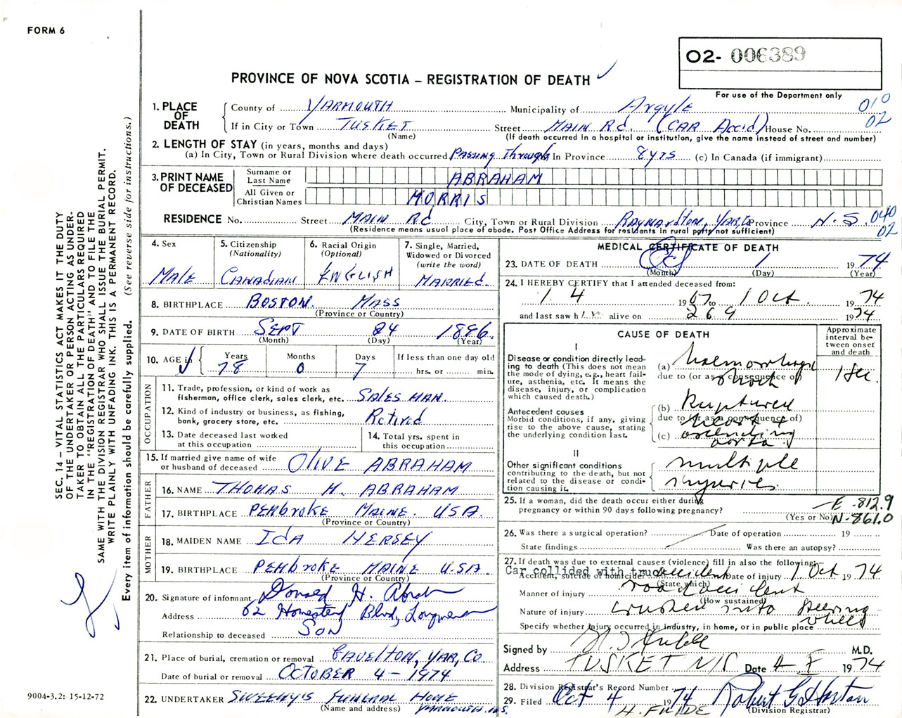 Male Death Registration: Year: 1974 number: 6389