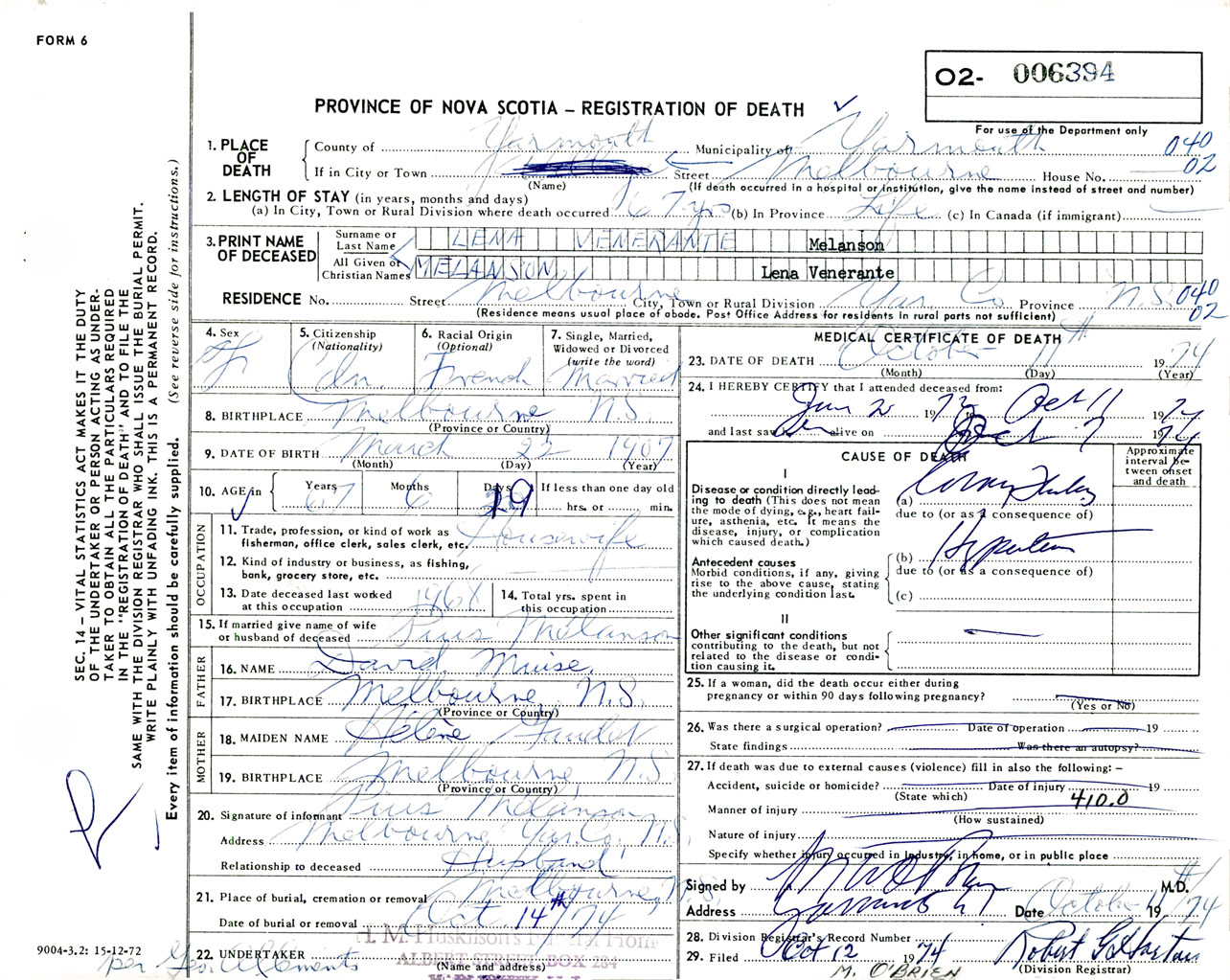 Female Death Registration: Year: 1974 number: 6394