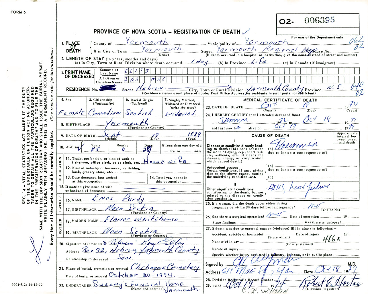 Female Death Registration: Year: 1974 number: 6395