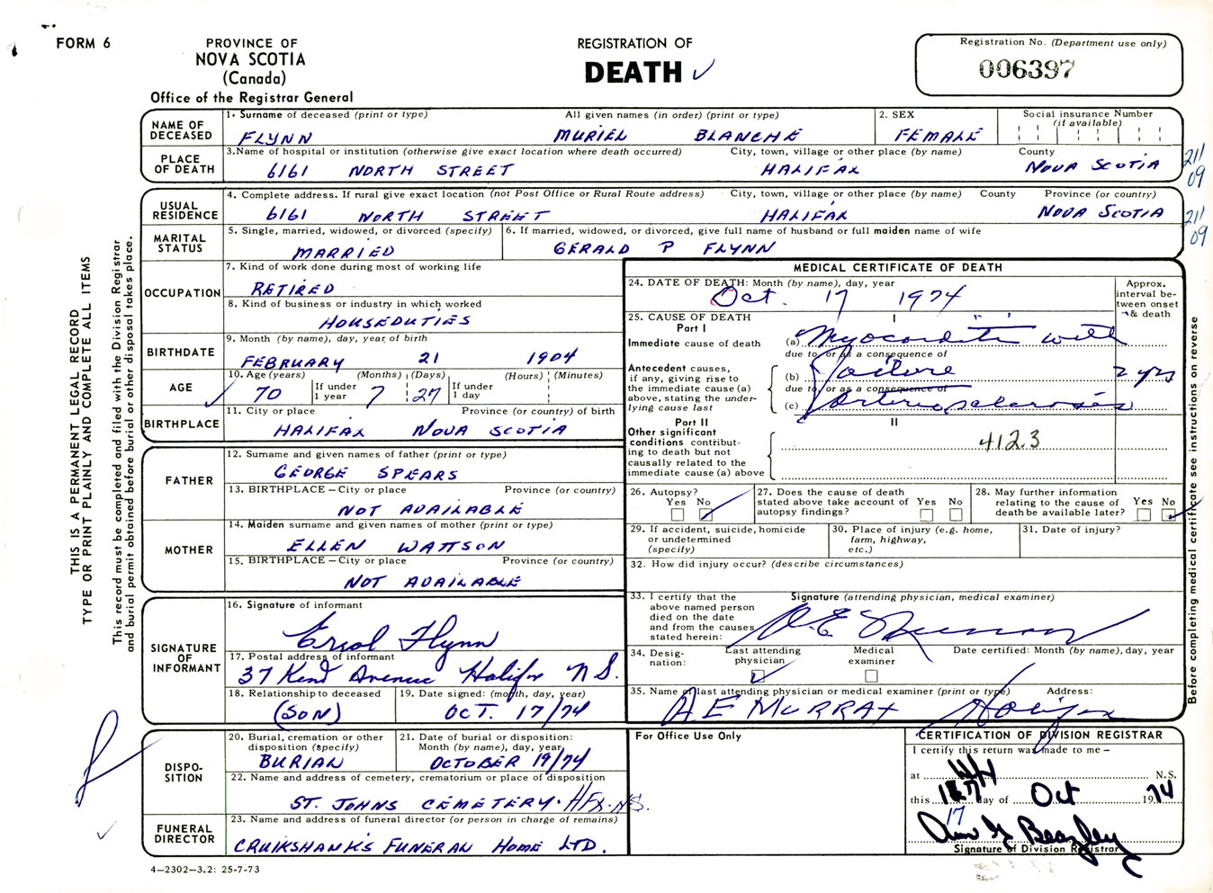 Female Death Registration: Year: 1974 number: 6397