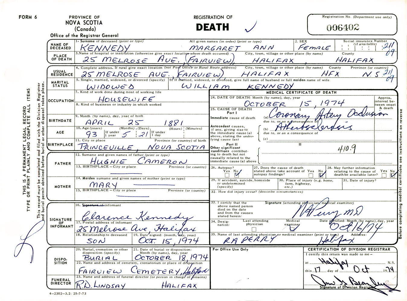 Female Death Registration: Year: 1974 number: 6402