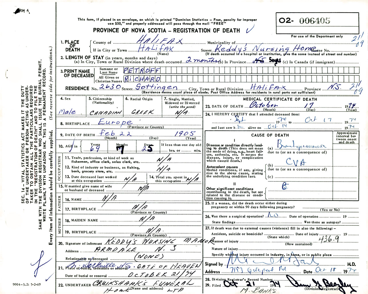 Male Death Registration: Year: 1974 number: 6405