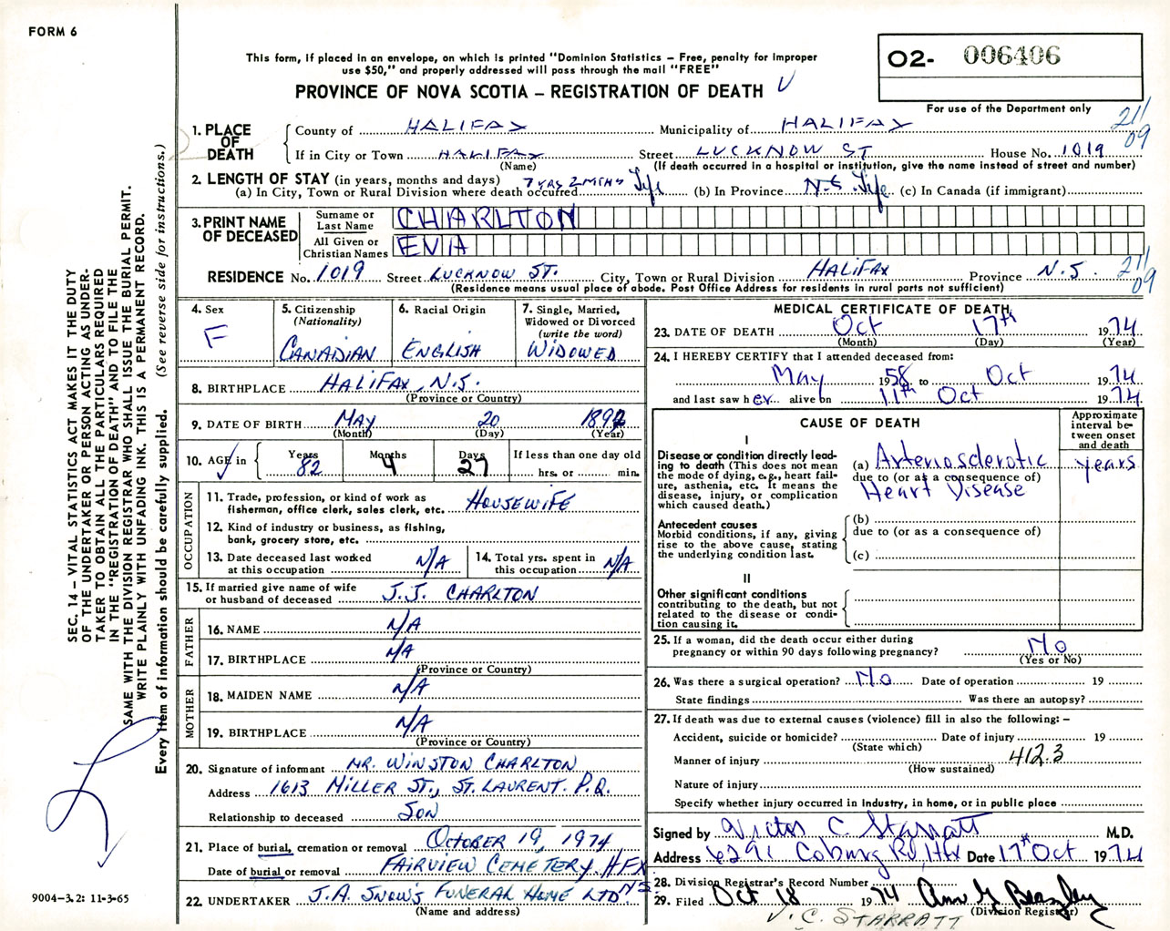 Female Death Registration: Year: 1974 number: 6406