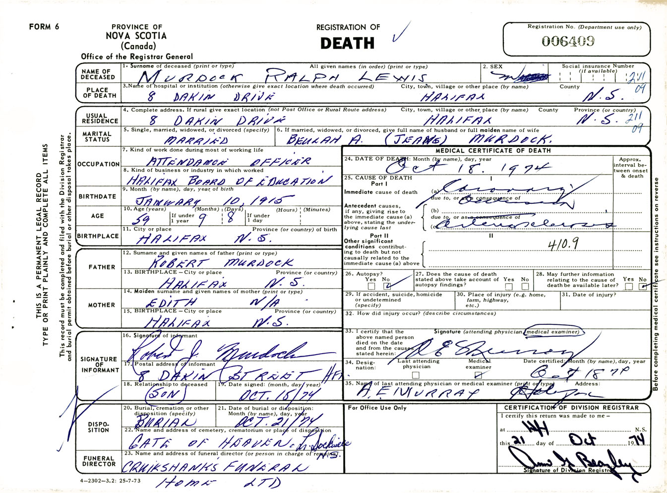 Male Death Registration: Year: 1974 number: 6409